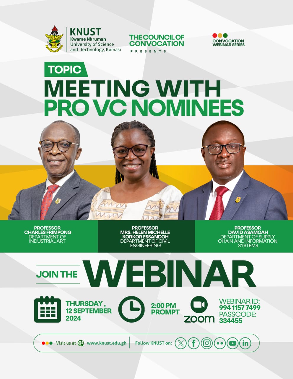 The KNUST E-Learning Centre has hosted a webinar on the nominees for the position of Pro Vice-Chancellor. The webinar, held in the center's multimedia studios, provided a platform for the candidates to discuss their visions and respond to questions from the university community. Professor Charles Frimpong from the Department of Industrial Art, Professor Mrs.